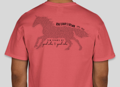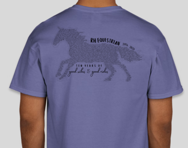 From 2016-2026, we have had so many adventures with so many incredible horses and people. We are excited to commemorate our 10th (and final!) year with a custom design by local artist Alexandria Hurd. On the back is featured many of the horses and people (but definitely not all!!) who have made an impact on our barn community. We are so thankful for you all! Please fill out the following form to place an order for a shirt. Colors may vary slightly from above.